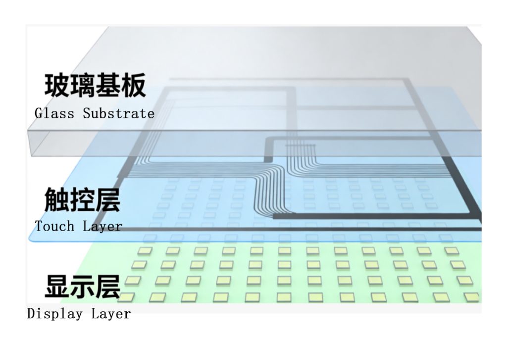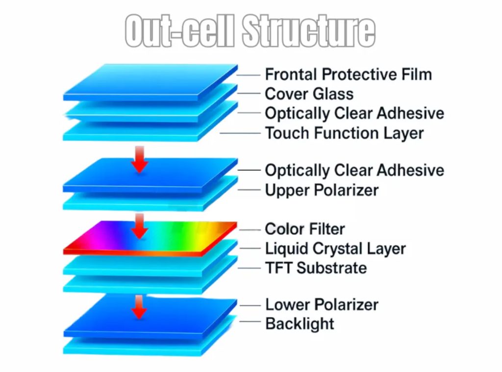 • Traditional TFT LCD: Display panel and touch layer are separate components joined by lamination.