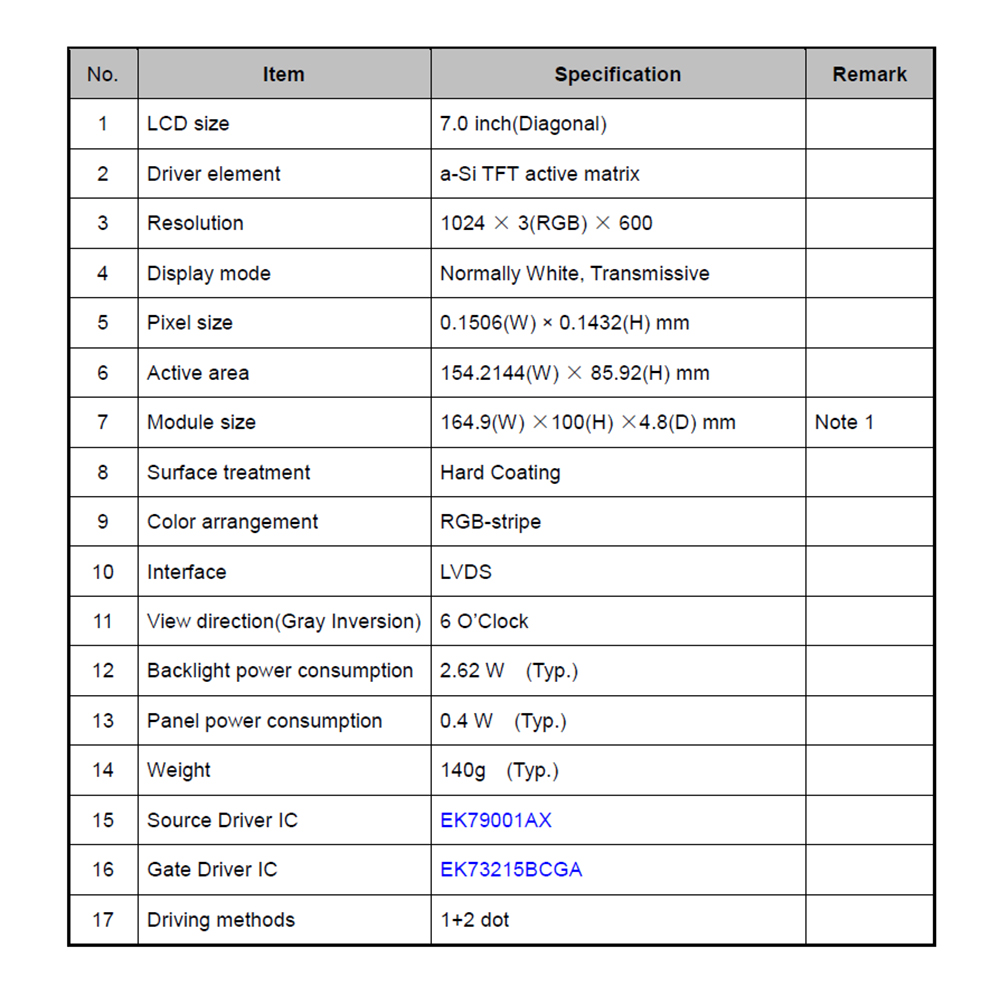 Key features of this display include a WLED backlight, U/D and L/R reverse functionality, and 6/8-bit color depth. Due to its robust feature set, this model is ideally suited for applications like automotive displays. The panel also incorporates built-in EK79001AX + EK73215BCGA driver ICs. According to production records, Innolux started mass production of this model in Q2 2017, and it remains in active production today.