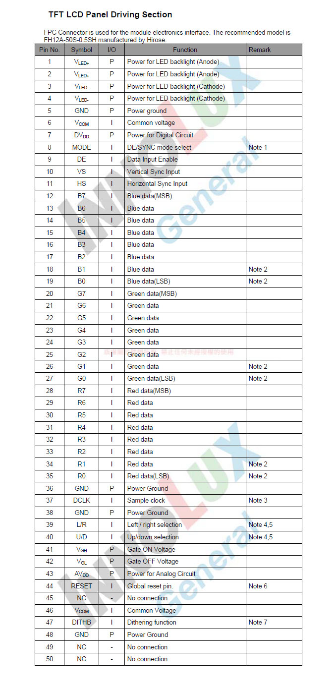 Easy Integration: 50-pin FPC connector supports 18-bit RGB data input and is compatible with both DE and SYNC modes.