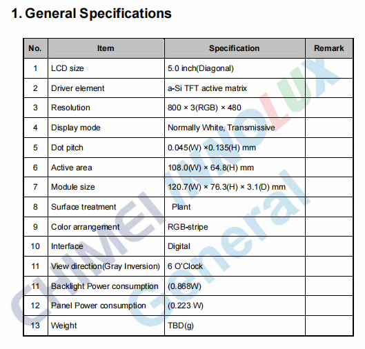High-Clarity Display: 5.0-inch diagonal display area with a dot pitch of 0.045 × 0.135 mm and an active area of 108.0 × 64.8 mm. Features vivid colors and wide viewing angles (typical 70° horizontal/vertical).